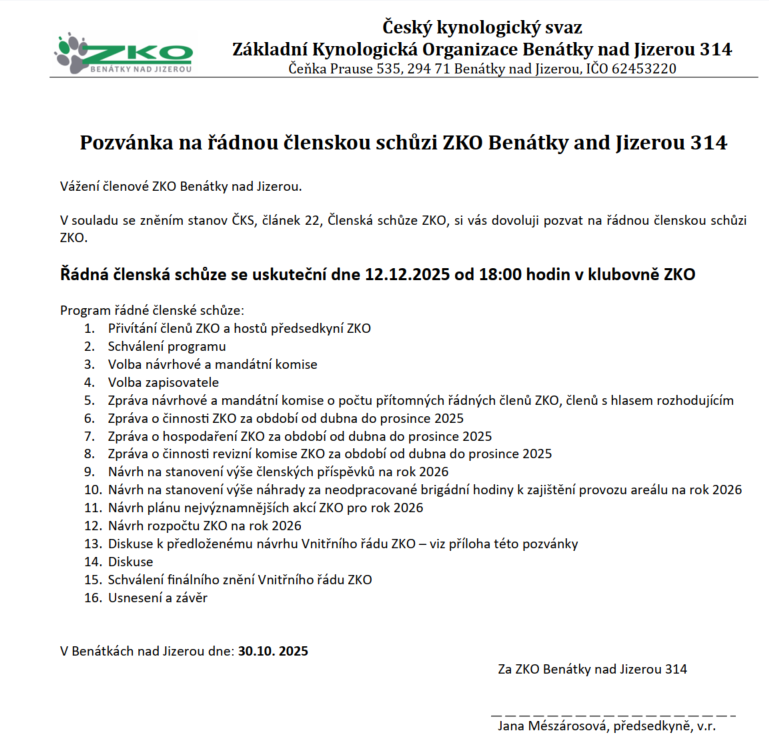 V souladu se stanovami ČKS svolává výbor ZKO Členskou schůzi.
